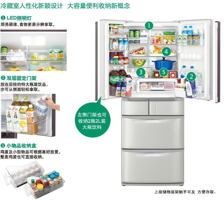注1:在周围温度20℃并不开冰箱门的条件下,R-SF56AMC急冷冻与低温冷冻时吹出的冷气温度约为-40℃。