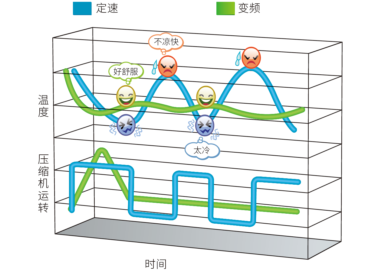 直流变频空调器通过微处理器来调节压缩机转速、能快速启动并到达预期温度,之后压缩机长时间处于经济的慢转速状态,保持温度恒定,节能舒适。