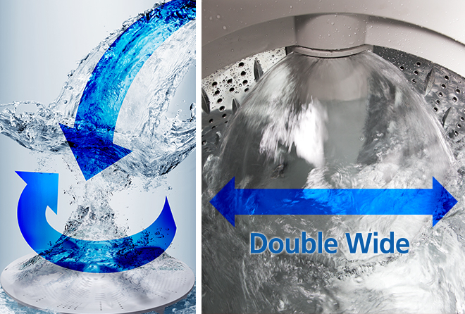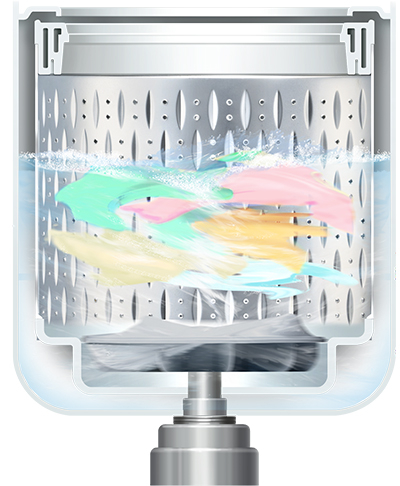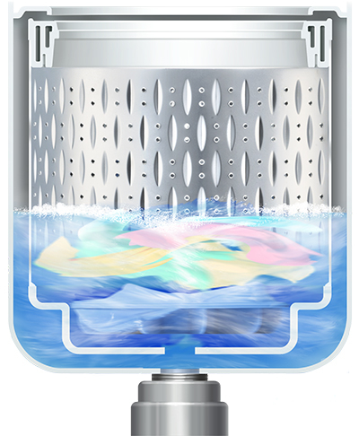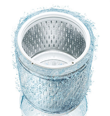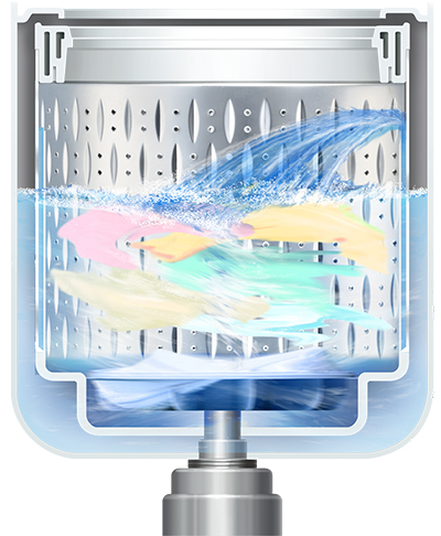 随着不锈钢筒的高速旋转,波轮叶片和筒一起强力地搅动筒中的水,达到清洁污垢的效果。